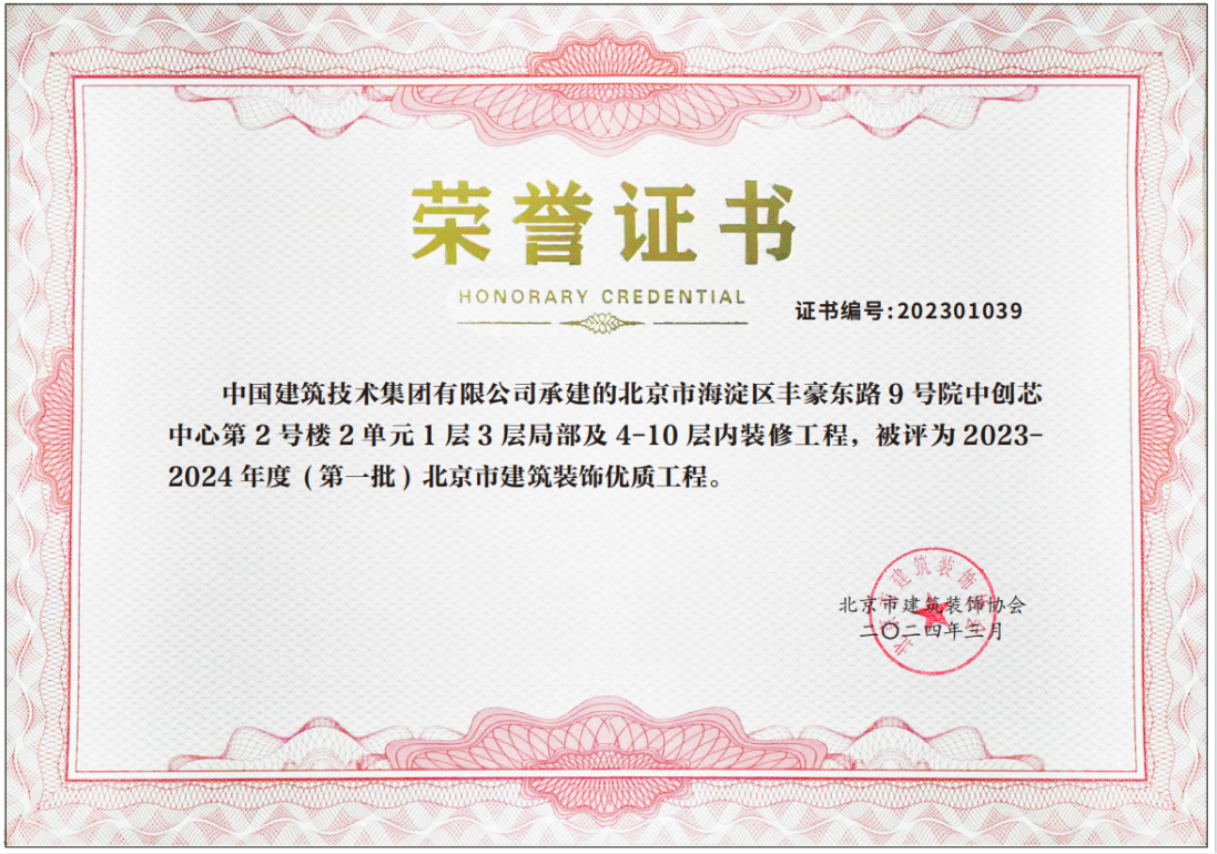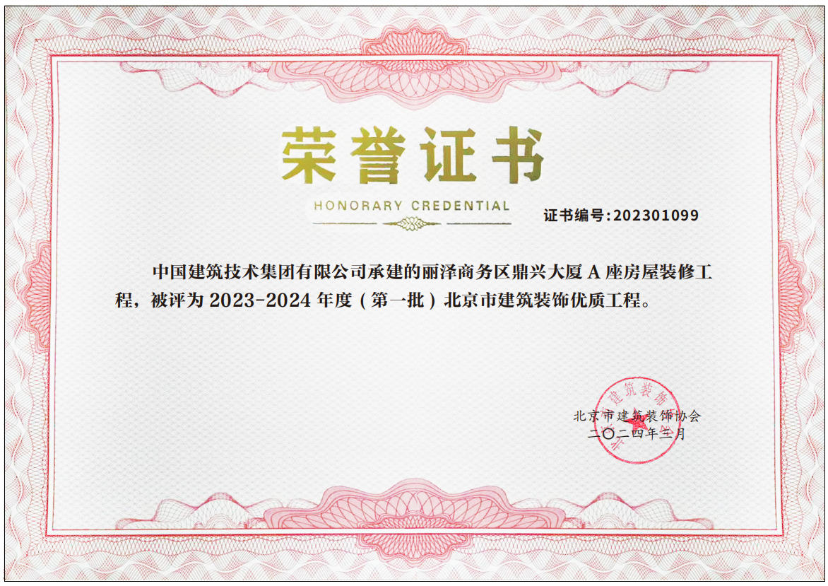 近日,由中國建技承建的麗澤商務區鼎興大廈A座房屋裝修項目、北京大學醫學部圖書館工程施工總承包項目和北京市海淀區豐豪東路9號院中創芯中心某公司改造項目榮獲2023-2024年度(第一批)北京市建筑裝飾優質工程獎。