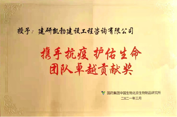 3月27日,集團公司下屬子公司建研凱勃建設工程咨詢有限公司(以下簡稱“建研凱勃”)榮獲國藥集團中國生物北京生物制品研究所頒發的“攜手抗疫護佑生命”團隊卓越貢獻獎。
