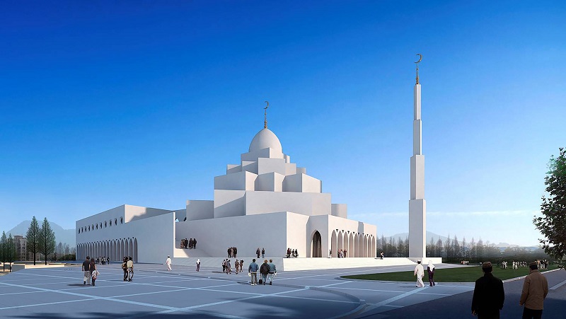 鄂爾多斯東勝區清真寺位于城市主干道東南,清真寺的要素【“米哈拉布(凹壁)”、“齊布拉墻”、“禮拜殿”、“庭院”、“環廊”。
